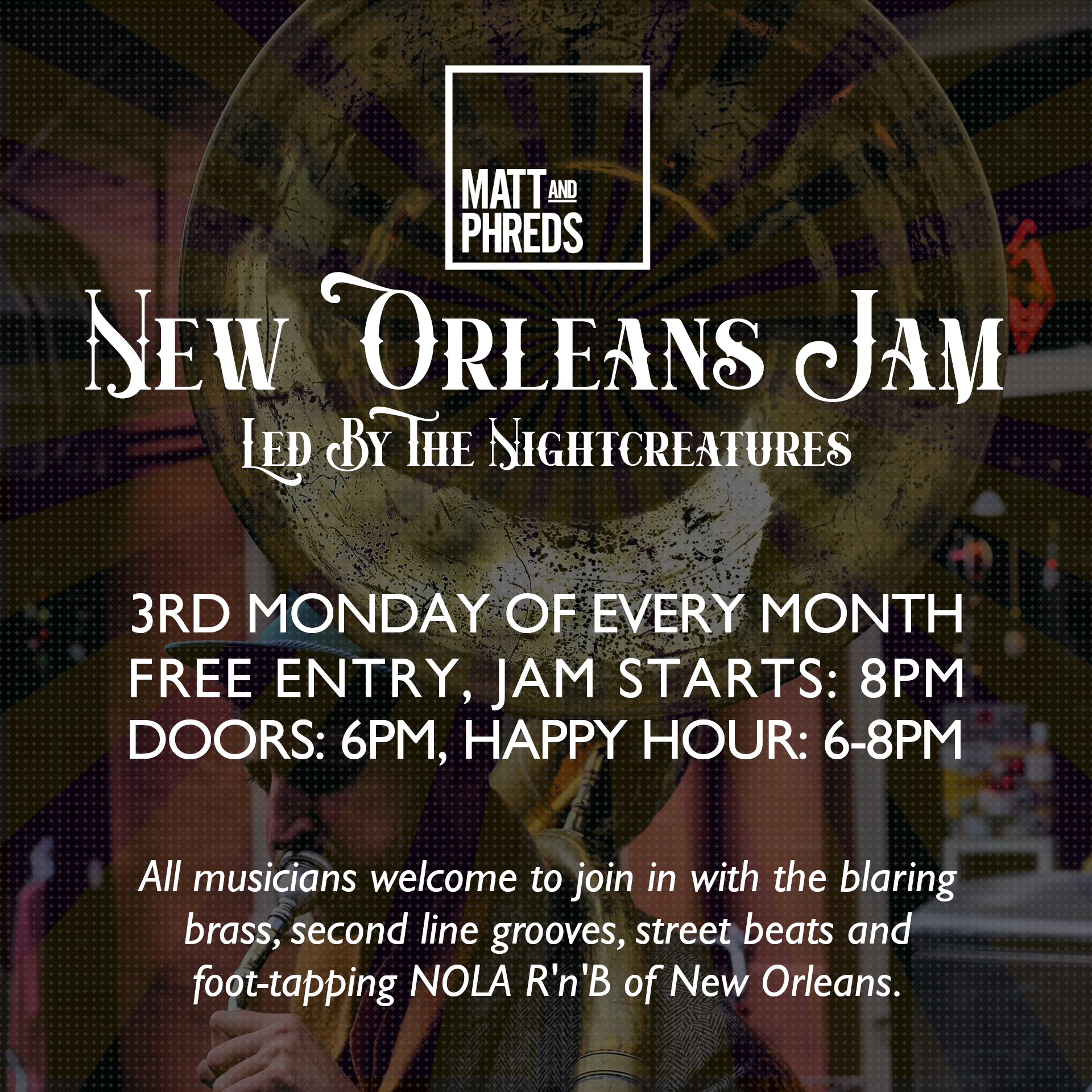 The big sounds of New Orleans come to M&P’s for the New Orleans Jam, held every 3rd Monday of the month and hosted by mighty house band The Nightcreatures. With a strong emphasis on the involvement of brass, these monthly Jam sessions are sure to make you feel like you’ve travelled over the Atlantic to Louisiana.